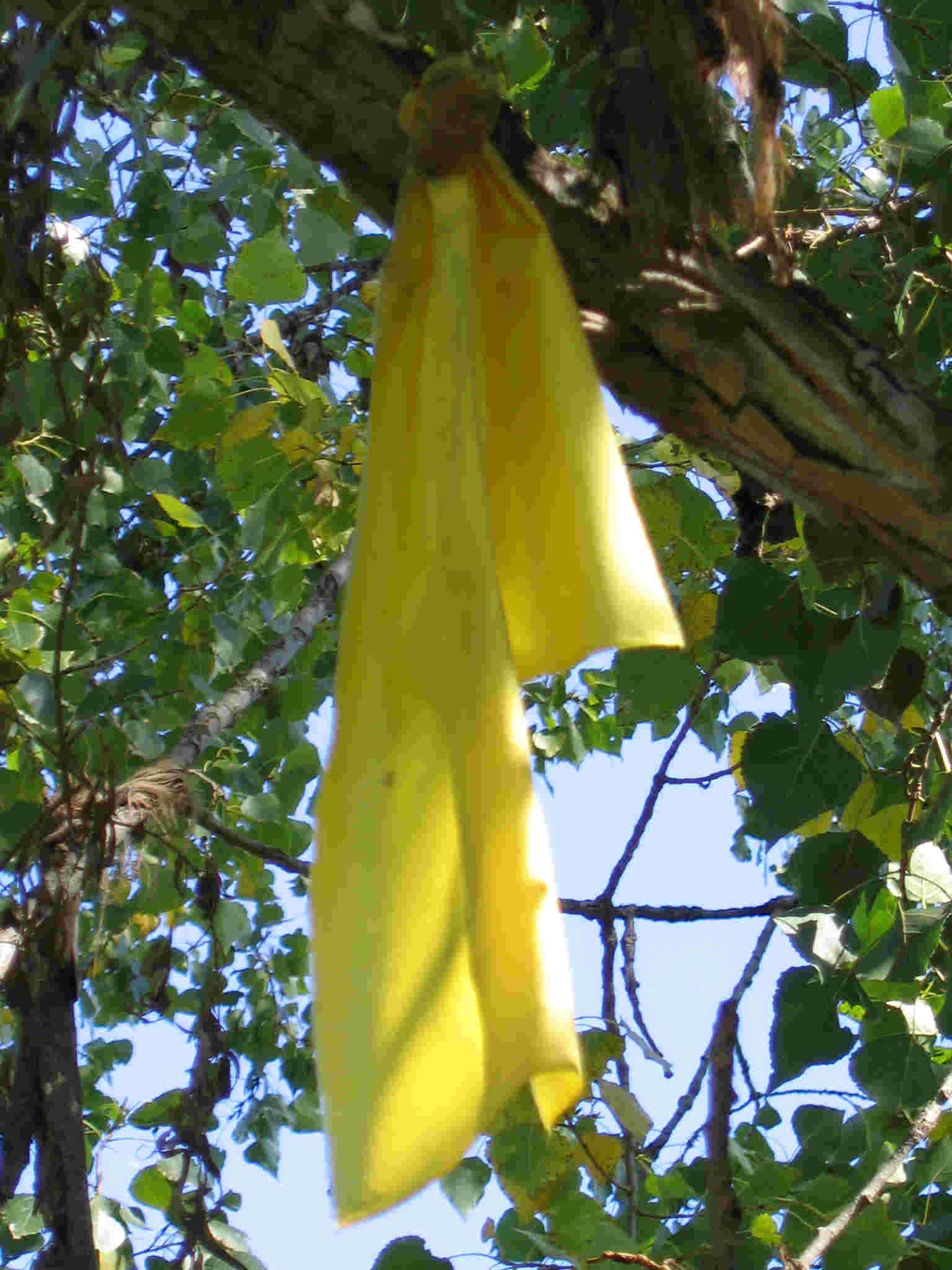 Pick up the yellow cloth, and drape it, centered, over the thumb edge of your left hand (if you are right handed). Rotate your hand so that it is palm up. One edge of the cloth will be longer than the other. Pick up a few tips of cedar and a few pieces of tobacco, and place them on the cloth in your palm. Fold over the narrow edges over the pile, and twist into a knot about 2 inches (5cm) around. Take the longer end of the cloth, and pull into a loop around the cedar and tobacco knot. Pull the knot though the loop and tie off.